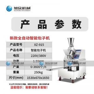 名稱XZ-915智能包子機 電源220/380v 功率1.55kw 產量0-36000個/h 尺寸1530*670*1650mm 重量250kg 規格 其他
