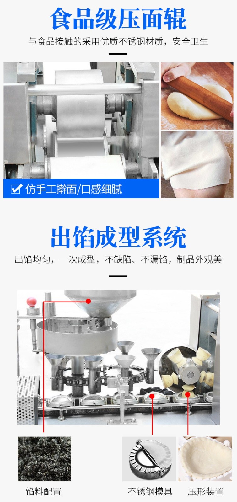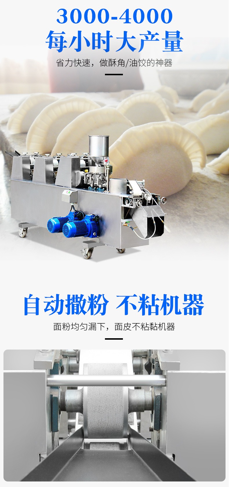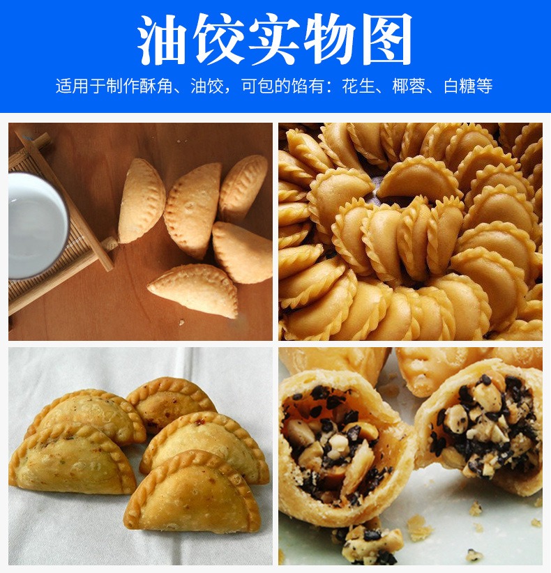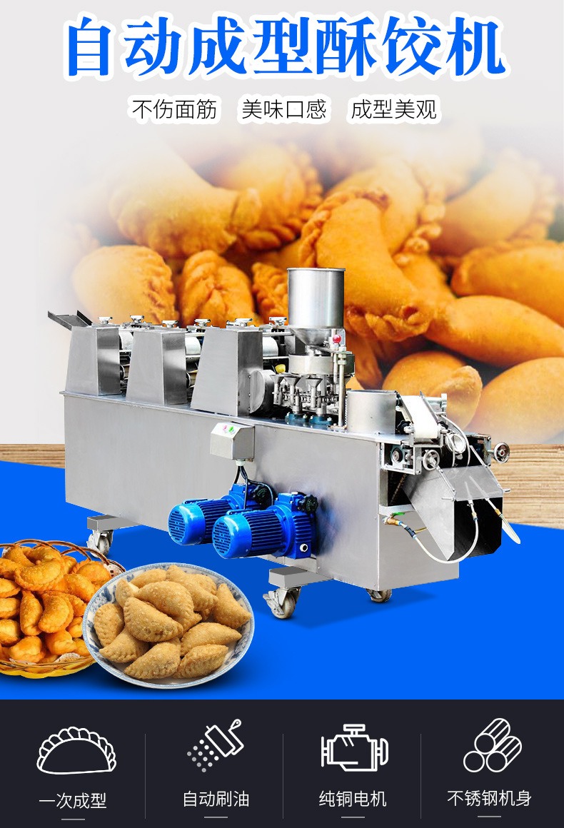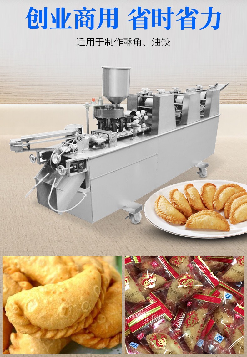 自動成型油餃機,創業商用、省時省力。適用于制作酥角、油餃。3000-4000每小時大產量。省力快速,做酥角、油餃的神器。自動撒粉 不粘機器。面粉均勻漏下,面皮不粘黏機器。