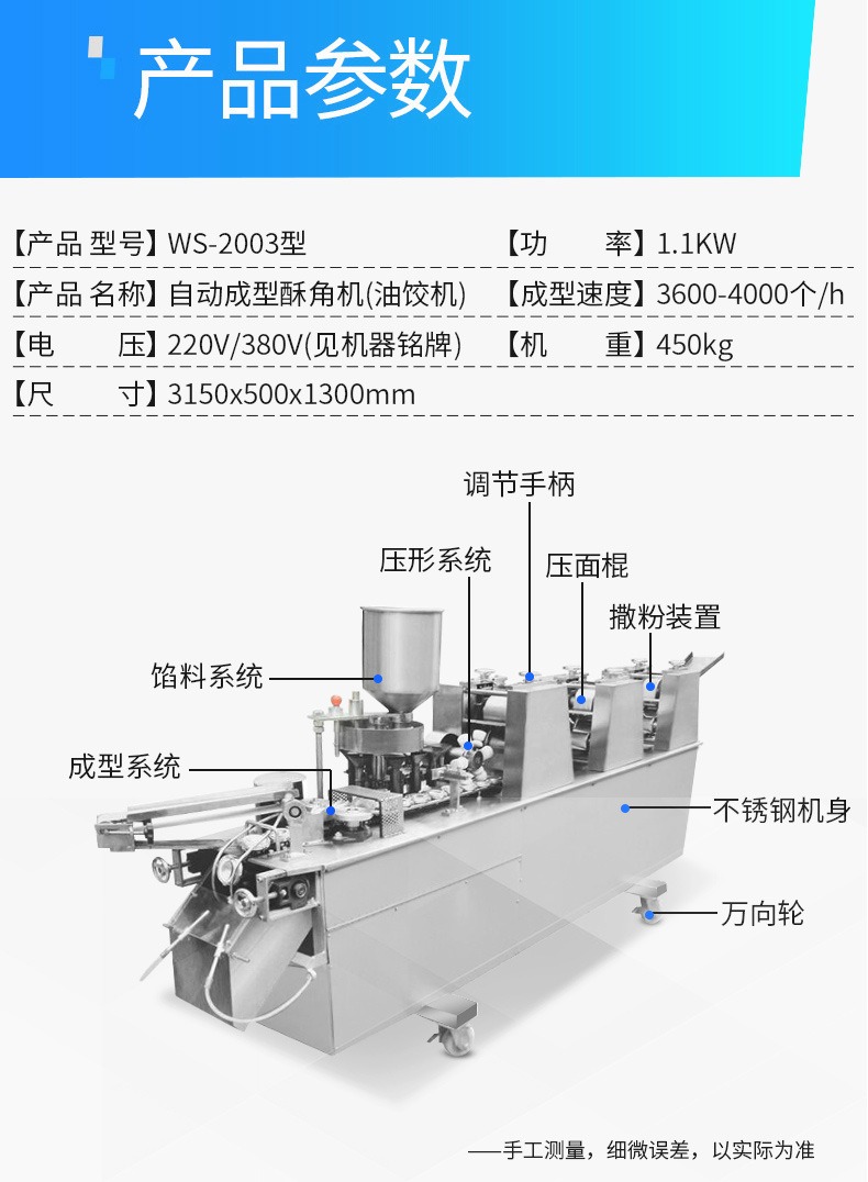 名稱自動成型油餃機 電源220V/380V(見機器銘牌) 功率1.1KW 產量3600-4000個/h 尺寸3150x500x1300mm 重量450kg 規格需要請聯系客服 其他