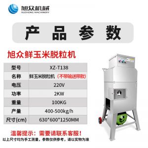 XZ-T138玉米脫粒機,鮮玉米脫粒機,高效脫粒。用于新鮮甜糯玉米脫粒工作,能很方便地把籽粒與梗桿分離。入料方便、脫凈率高、不碎粒不爛芯。每分鐘處理75個玉米穗。高效脫粒,滿足商用,籽粒產量約為500-600Kg/h