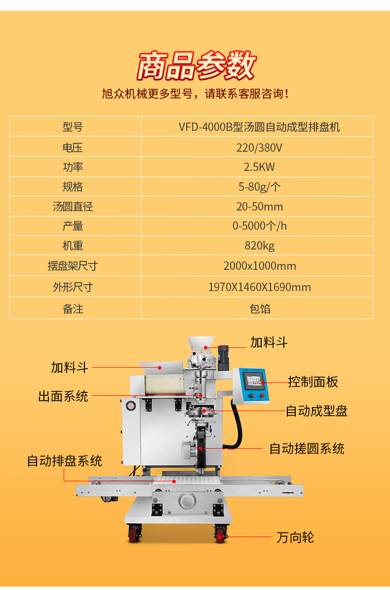 今天給大家介紹一下這款VFD-4000B型湯圓機,為什么要介紹它呢,這款機械制作多品種食品,關鍵是產量效率高,1小時的產量可達5000個,相當于20-30個工人同時手工制作湯圓,真正的低投入,高收益,省錢省工,可制作各式包餡食品,如湯圓、豆沙包、南瓜餅等,是賓館、飯店、企業、學校、部隊等公共食堂和專業戶理想的面食機械。